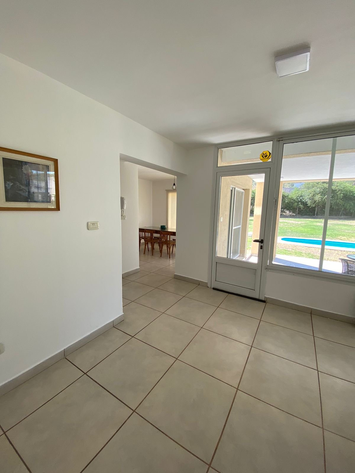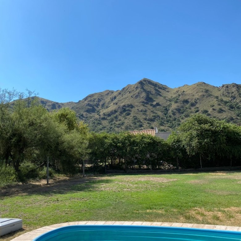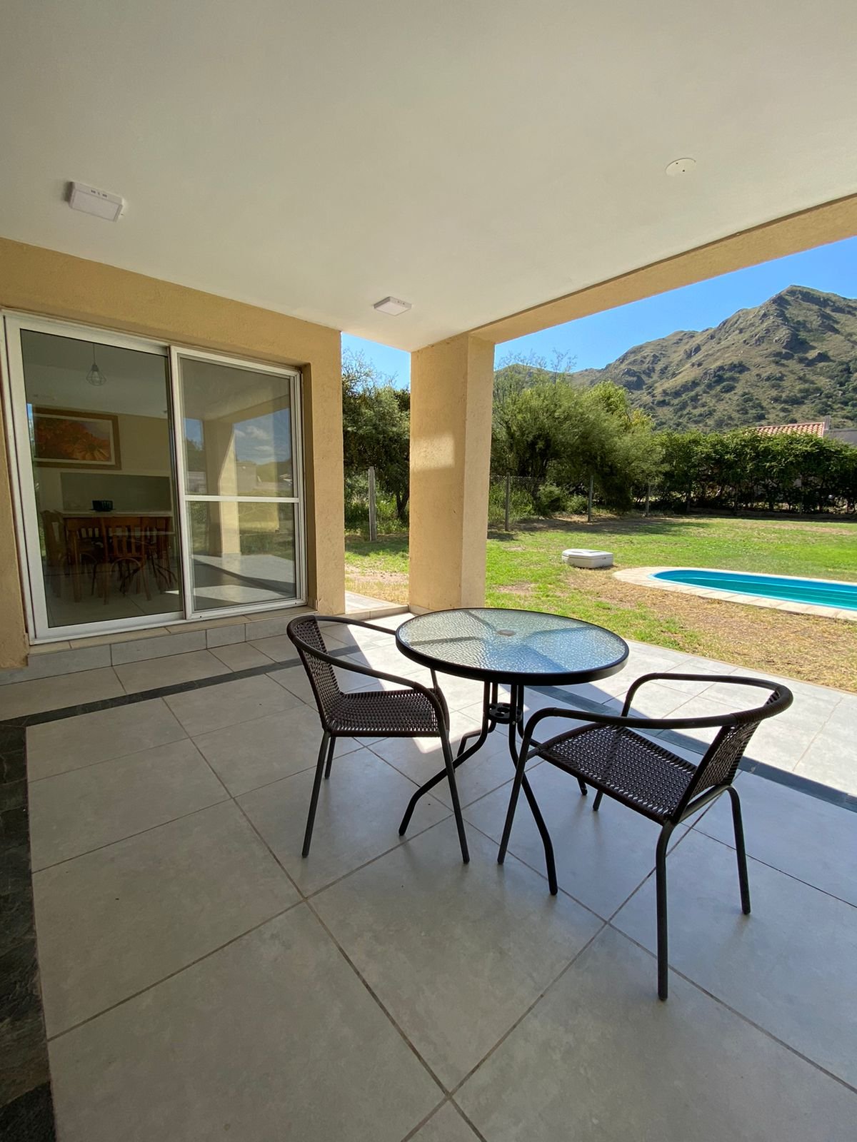 Patio parquizado con piscina.