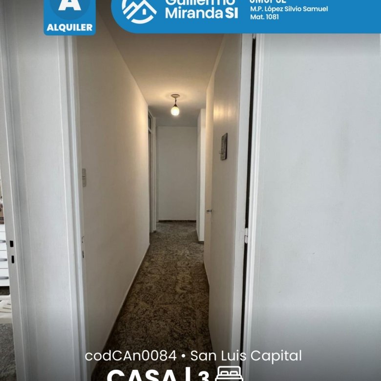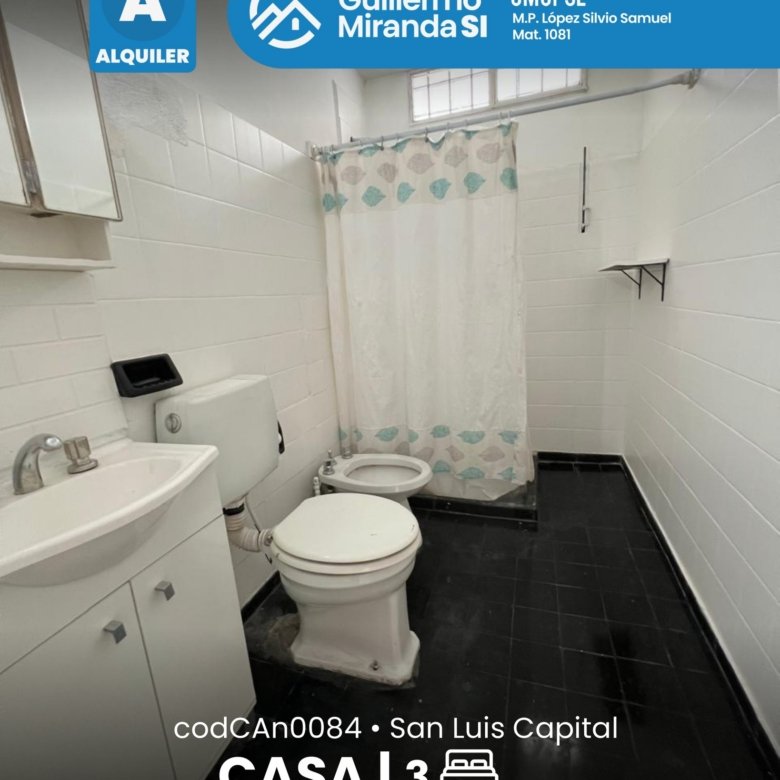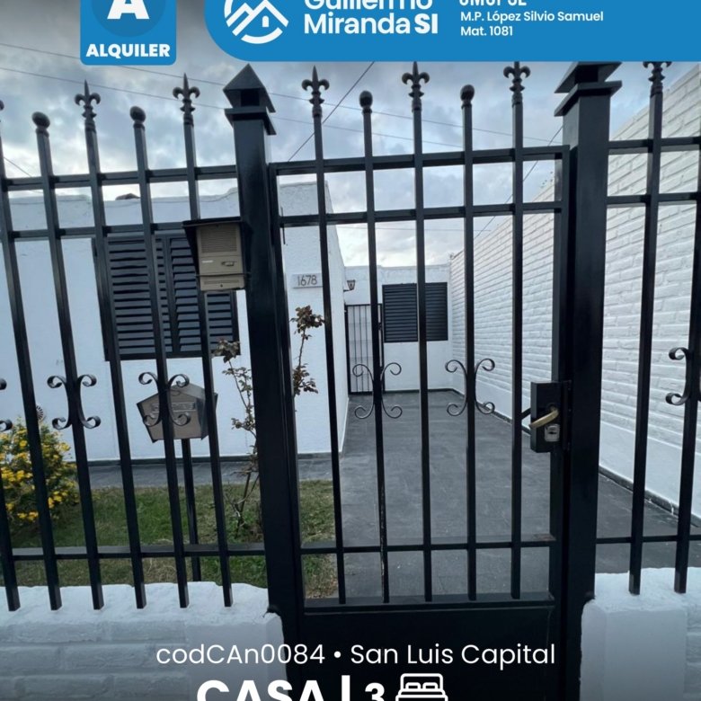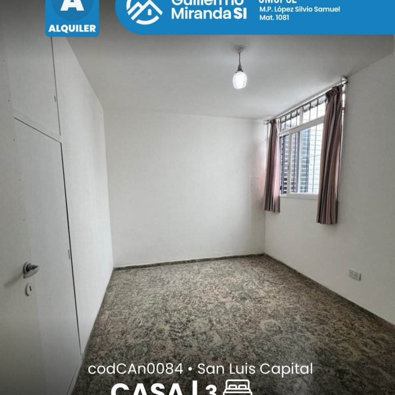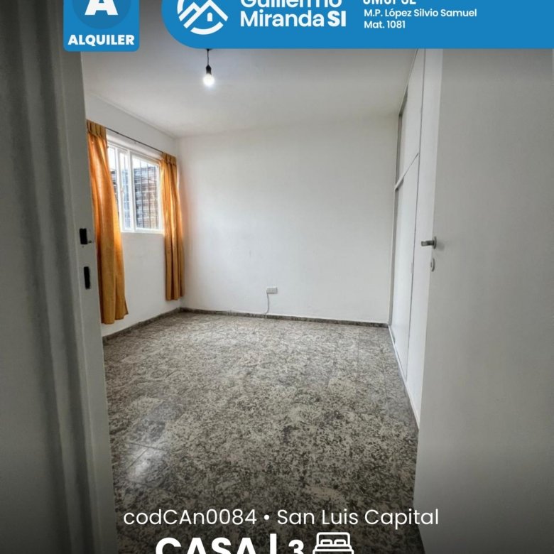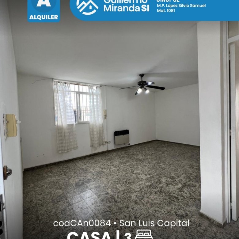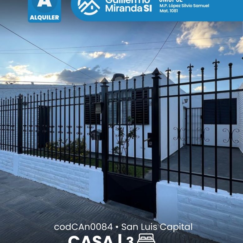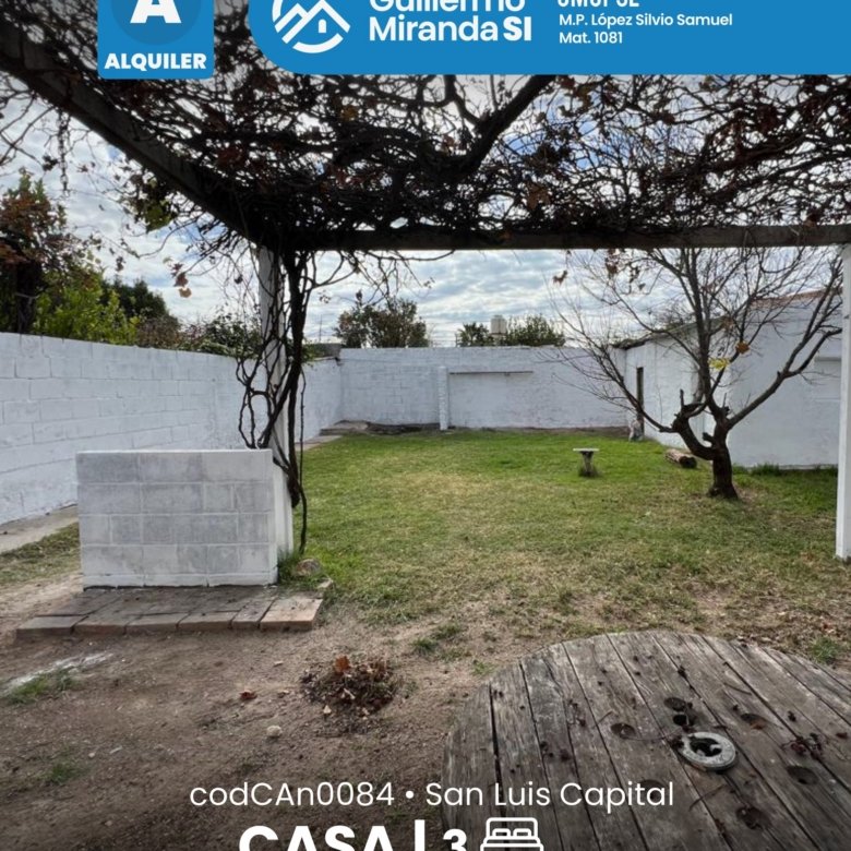 Casa en alquiler en estado general impecable. Cuenta con 3 dormitorios, 1 baño, living comedor, cocina, cochera y patio. La propiedad dispone de todos los servicios.