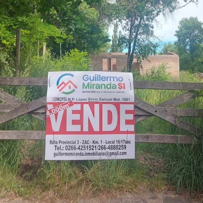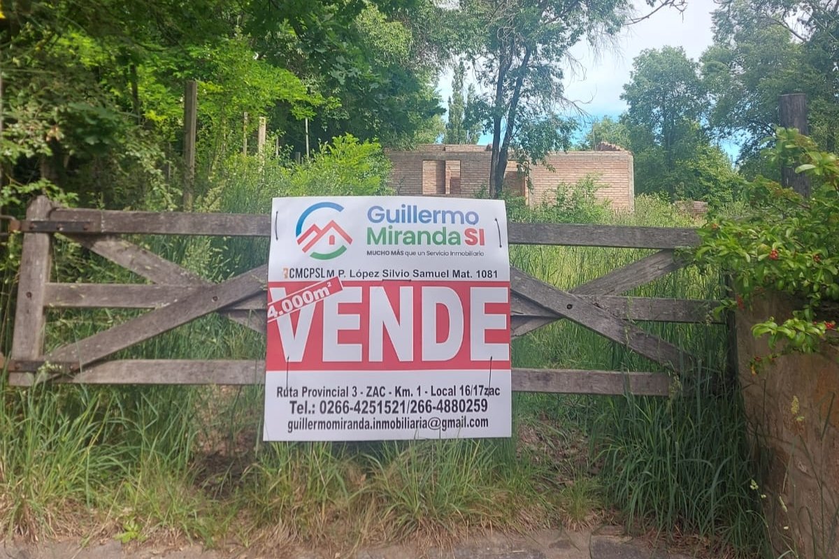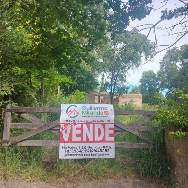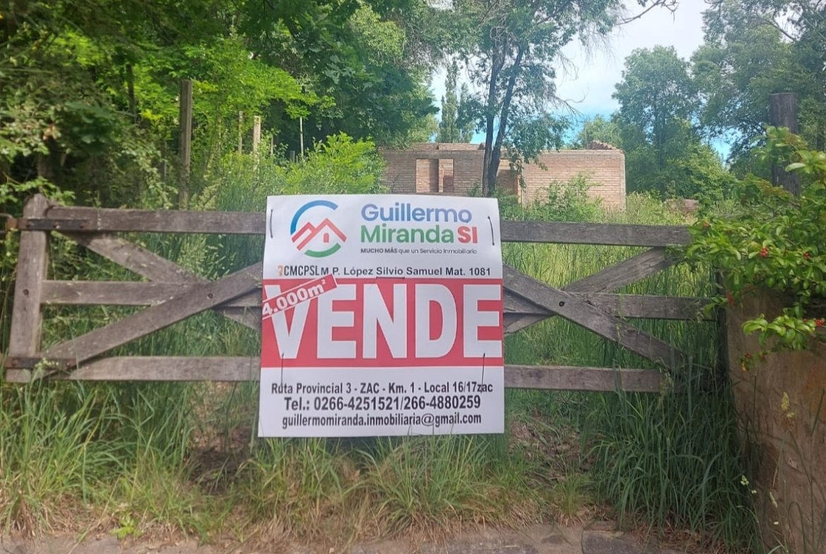 Oportunidad. Terreno de 4.000 m² en ubicación estratégica, con ingreso sobre plazoleta en la entrada al pueblo de La Carolina. Cuenta con una construcción en obra gruesa sin techos, proyectada para dos casas contiguas. Además, dispone de una habitación completa de aproximadamente 60 m² destinada a cochera o depósito. Amplio frente y excelentes vistas hacia el acceso al pueblo.